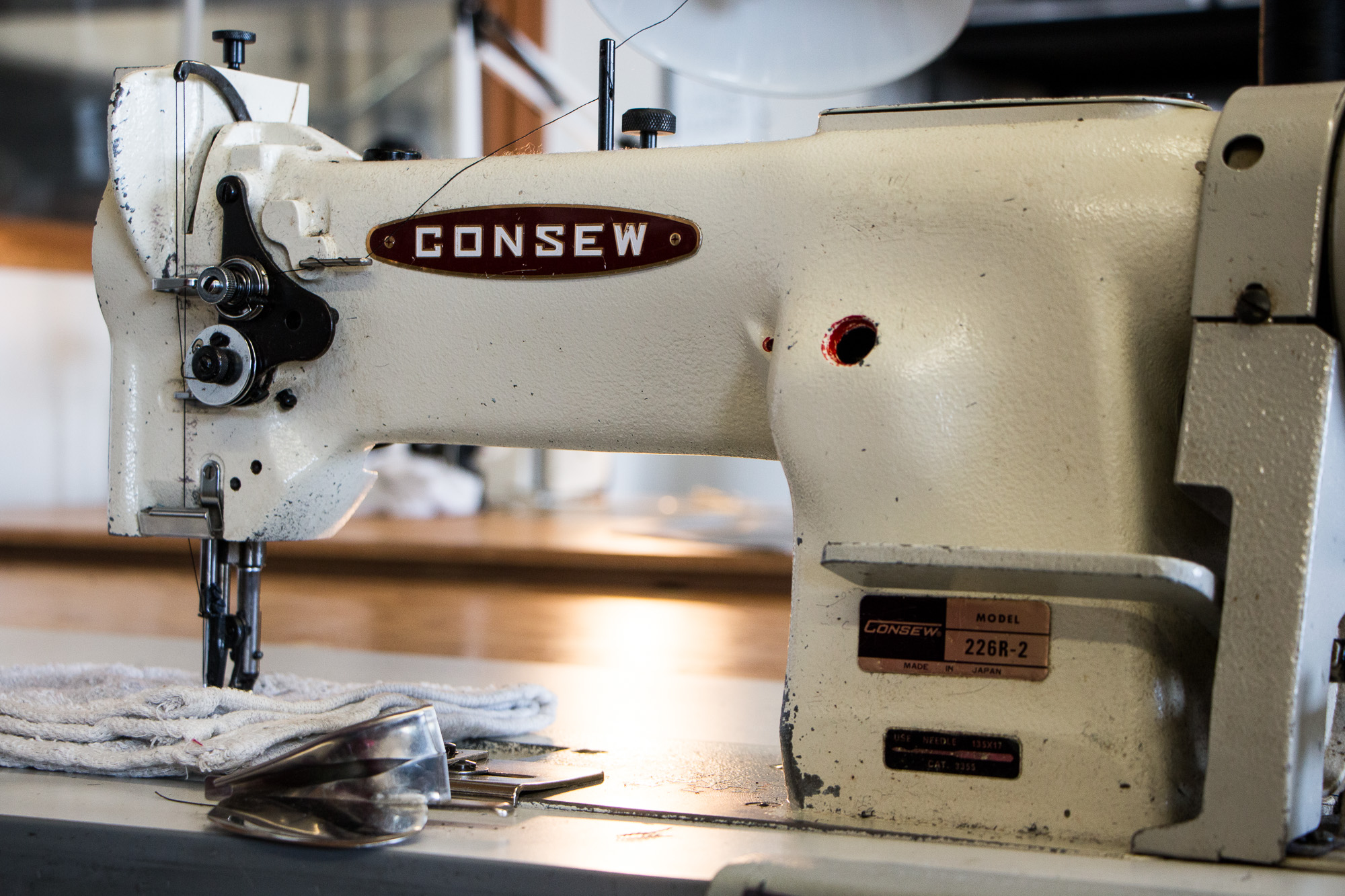 Premium Photo Close Up Of Details Of Modern White Professional Electric Sewing Machine On A Table In Factory Work Place Of Seamstress No People