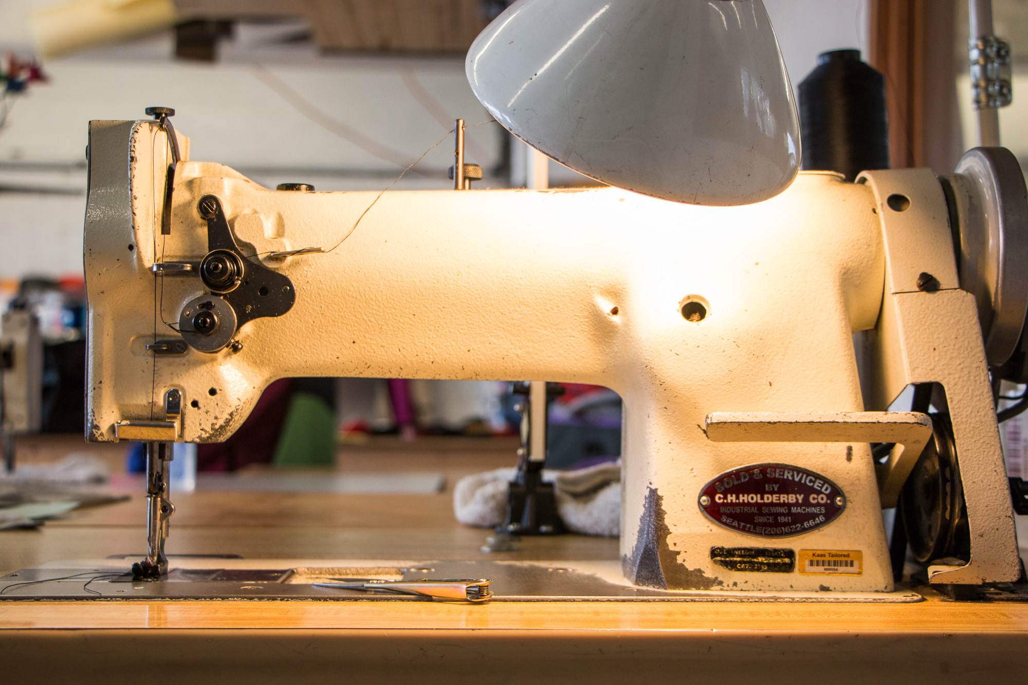 Premium Photo Electric Sewing Machine On The Table Sewing Supplies Spools Of Thread At The Tailors Workplace